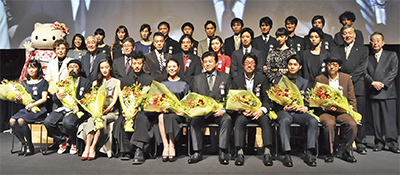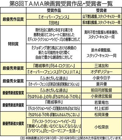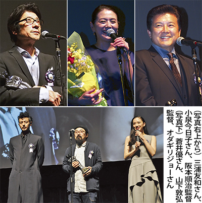 市民ボランティアで結成された実行委員会が主催する同映画祭は今年で26回目。7年前からは「明日への元気を与えてくれる・夢をみせてくれる活力溢れる”いきのいい”作品・監督・俳優」を映画ファンの立場から感謝を込めて表彰する「TAMA映画賞」を選出、表彰を行っている。その映画賞授賞式には、各賞受賞者(表参照=写真=)が登壇し、竹内昇実行委員長らから記念の盾とトロフィーなどが手渡された。