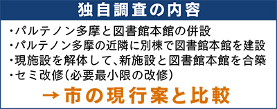 調査内容は【1】「パルテノン多摩と図書館本館の併設」【2】「パルテノン多摩の近隣に図書館本館を別棟で建設」【3】「現施設を解体して新施設と図書館本館を合築」【4】「セミ改修(必要最小限の改修)」の4案の可能性を探り、市の現行案と比較しようというもの。