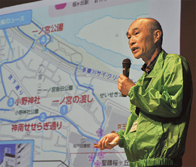 当日、会場には満員となる約150人が訪れ、入口で今回制作した「聖蹟桜ヶ丘コース」「永山コース」「多摩センターコース」3種類のマップが配布された。会の冒頭、阿部裕行多摩市長が登壇し「ぜひこのマップを手に歩いてもらって健康づくりに役立ててほしい」と挨拶した。