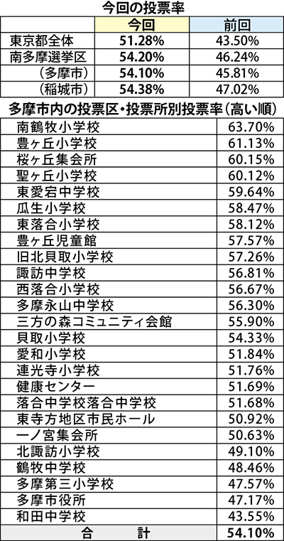また多摩市内の投票区・投票所別の投票率(表参照)は、4カ所で60%を超えた。最も高かったのは南鶴牧小学校で63・70%、次いで豊ヶ丘小学校の61・13%、桜ヶ丘集会所の60・15%、聖ヶ丘小学校の60・12%と続く。