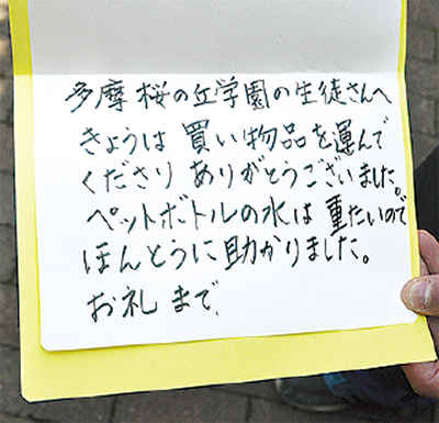「荷物をお運びします!」。周囲に響く子どもたちの声。連光寺・聖ヶ丘地域福祉推進委員会(岡田掊(おさむ)委員長)と都立多摩桜の丘学園は6月23日、スーパー「ビッグ・エー多摩聖ヶ丘店」の協力を得て、買い物客の荷物を自宅まで運ぶ「買い物支援事業」を行った。地域の買い物弱者を地域で支援しようと企画された同事業。同委員会では「少しずつ続けていけたら」と話し、今後の地域の支え合い事業として注力していく意向だ。