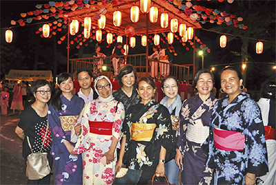 市内各所で夏祭りが行われる中、8月5日・6日に開催された一ノ宮自治会主催の「納涼盆踊り大会」に市内在住の外国人6人も浴衣を着て参加した=写真上。