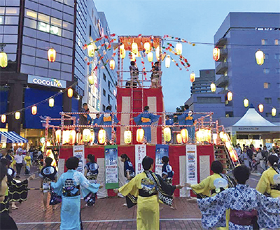 また同日、多摩センターココリア前十字路で、落合自治連合会・多摩センター商店会主催の「落合夏祭盆踊り大会」も行われ、地元住民やハローキティらも参加して、盛り上がりを見せていた=写真下。