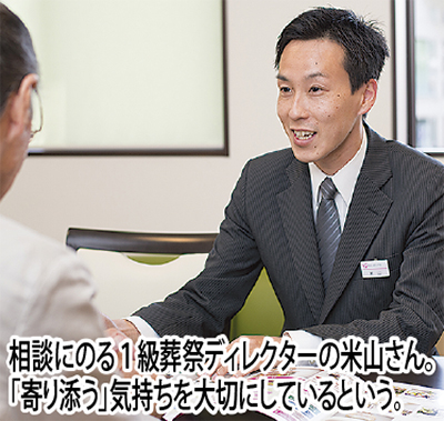 「お仏壇やお墓、遺品整理、海洋散骨など、『終活』全般をサポートさせて頂いております」と話すのは、同施設に在籍する1級葬祭ディレクターの米山純平さん。葬儀の事前相談(無料)では「寄り添う気持ち」を大切に、相談者と向き合っているという。相談者の一人は「こんなことを聞いてもいいの、という質問やデリケートな金銭的な相談にも真摯に対応してもらえた。おかげで”無理のない”範囲で希望通りの葬儀ができました」と笑顔を見せる。「『もっとこうしておけば良かった』と後悔してほしくないんです。だから、突然の場合でも戸惑うことがないように、事前相談を皆様に勧めています」と米山さん。最近は子どもに迷惑をかけたくないと、自分の葬儀に関する相談に訪れる高齢者も増えているという。