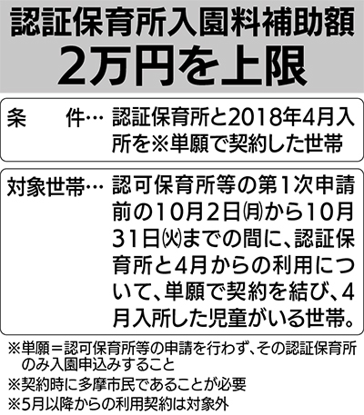 今回、補助対象となるのは、認可保育所等第1次申請前の10月2日から31日の間に、東京都認証保育所と2018年4月からの利用について単願(認可保育所等の申請を行わず、その認証保育所のみに入園申込みをする)で契約を結び、4月入所した児童がいる世帯。条件は、契約時に多摩市内在住であること。5月以降からの利用契約については対象外となる。