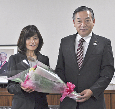 この日、市役所を訪れた野口さんは阿部市長から花束を手渡され、今回の優勝を報告。阿部市長は「怪我から復帰した野口さんの姿は市民だけでなく、日本全国の多くの人たちの希望になる。ぜひそれを伝え続け、東京パラリンピック目指して頑張って下さい」と激励した。