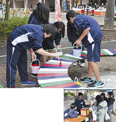 生徒たちは、地域の企業や商店、保護者らに出店や募金の協力、賞品の提供を呼びかけるなど奔走。当日は、104人の生徒たちが古くなった商店街のベンチや花壇を清掃、ペイントする「アートプロジェクト」や、事前に保護者や地域から集めた本や物を使った「物々交換フリーマーケット」、訪れた人たちが楽しめる顔出しパネル、ビンゴ形式のスタンプラリー、商店街・今昔写真館など、生徒自らが考案した様々な企画を実践。通りかかった地域住民も子どもたちに誘われ、各企画を楽しんだ。