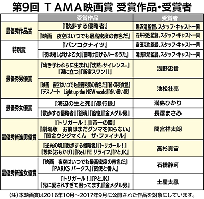 また「本年度最も心に残った男優」を表彰する最優秀男優賞は『幼な子われらに生まれ』『沈黙-サイレンス-』などに出演した浅野忠信さん、『映画 夜空はいつでも最高密度の青色だ』『続・深夜食堂』などに出演した池松壮亮さんに贈られた。この日、出席できなかった浅野さんの代わりに登壇したプロデューサーの江守徹さんが、浅野さんからのメッセージを代読。「今回の受賞は大変光栄で本当に嬉しく思います。浅野忠信を選んでくれたTAMA映画祭の皆様、本当に本当にありがとうございます」と感謝の言葉が述べられた。また池松さんは「こんな賞は恐れ多くて坊主にしてきました」と会場の笑いを誘い、「個人的に思い入れがある渾身の一本。この賞をこの作品でいただけて嬉しく思う」と照れながら話した。