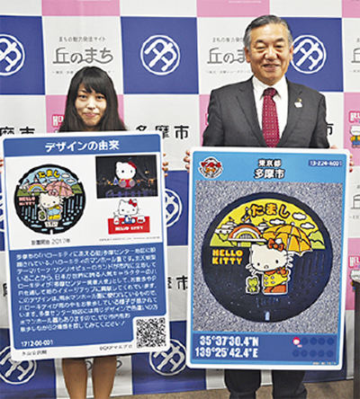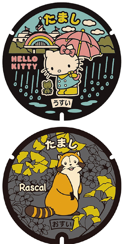 多摩市ではこのほど、下水道事業の啓発とシティセールスを目的として、「多摩センター親善大使」の「ハローキティ」がデザインされたマンホール蓋を制作し、多摩センター地区の9カ所に設置を進めている。1月以降には和田に制作スタジオを構える日本アニメーション(株)の代表的なキャラクターである「あらいぐまラスカル」がデザインされたマンホール蓋を聖蹟桜ヶ丘駅周辺に4カ所設置する予定だという。