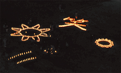 10年程前から地域の活性化と地域への感謝の気持ちを込めて実施され、永山団地の冬の風物詩として定着している。今年も、地元の瓜生小学校の児童をはじめ、地域住民たちが描いた切り絵やイラストで制作した行灯約600基を「笑」「ひまわりの花」=写真=で形作り、冬空の中でその幻想的な灯りが瞬いた。