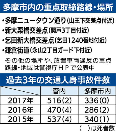 多摩市・稲城市を管轄とする多摩中央署では、過去の交通事故の実態等を踏まえ、重点路線・重点取締り場所として10カ所を指定。多摩市内では、多摩ニュータウン通りの山王下交差点付近、新大栗橋交差点、乞田新大橋交差点、鎌倉街道の永山2丁目ガード下付近の4カ所で、重点時間帯における速度違反取締りや、パトカーや白バイ等による赤色灯点灯走行等の警戒活動、交通事故に直結する交通違反の取締り等を実施している。また、放置車両違反についても、同じように重点路線、重点地域を定め、駐車監視員とともに取締りを強化しているという。