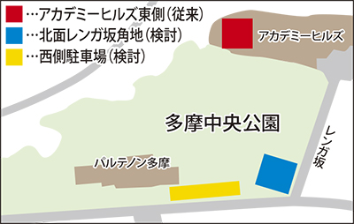 加えて、多摩アカデミーヒルズ東側での図書館本館の建替えについて、一部の議員から「駅から遠い」「土地交換に反対」などの意見が挙がったことなどもあり、市は同所での建替えを断念。新たな建替え場所として、中央公園内の北西レンガ坂寄りの角地として提案していた。