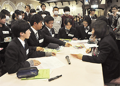 今年度は、東寺方、聖ヶ丘、東落合、貝取の4小学校と、落合中学校が参加。「環境」をテーマに、東寺方小は「ひのきの森のプロジェクト」、聖ヶ丘小は未来の聖ヶ丘を住みよい町に」、東落合小は「身近な自然環境をよりよく」、貝取小は「生き物と自然のつながり」、落合中は「3Rsで何ができるか」を発表した。発表後には、子どもたちが各グループに分かれ「30年後の多摩市が今以上に豊かな環境を持ち続けるために」をテーマに話し合い、そこで決まったメッセージ「全ての世代が 自分たちに出来ることを知り、連携して実行しよう!」を発表した。