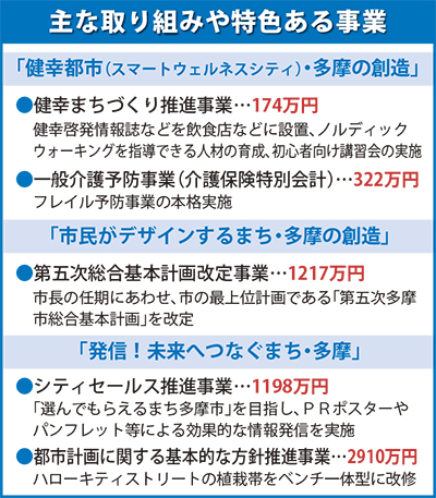 重点的な取り組みとして、「健幸都市(スマートウェルネスシティ)・多摩の創造」の中では、健康無関心層であっても生活の中で目に留まる飲食店などに健幸啓発情報誌を設置するなどの「健幸まちづくり推進事業」に174万円、糖尿病性腎症のリスクの高い被保険者に、地域の調剤薬局の薬剤師による支援を開始するなどの疾病予防に関する経費として743万円が計上された。