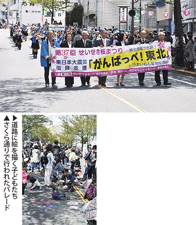 聖蹟桜ケ丘駅周辺で行われた「第37回せいせき桜まつり」は、駅周辺の9会場で様々な催しが企画された。ヴィータ前のさくら広場では、和太鼓の威勢の良い演奏で幕を開けた後、オープニングセレモニーが行われた。その後、さくら通りで恒例のパレードがスタート。この日、一日警察署長に任命された「ハローキティ」と警視庁マスコット「ピーポくん」を先頭に、「東日本大震災復興支援『がんばっぺ!東北』」のフラッグを掲げた実行委員会、落合中学校吹奏楽部、高円寺阿波おどり「江戸っ子連」「ひょっとこ連」、よさこい踊りと続き、沿道に詰めかけた観衆から大きな拍手が巻き起こった。