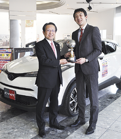 昨年創立50周年を迎えるにあたり、どのような地域貢献が良いか再検討したそう。「これからの時代を担う子どもたちをサポートしていくことに主軸を置こうと考えました。『車離れ』もあり、小さい頃から『車好き』でいてほしいという思いもあります」。そこで「地域(子どもたち)と一緒に」活動をしているスポーツチームの支援に力を入れるように。その一つがトレインズだった。「学校訪問など子どもたちに夢を与える活動をしている。そこに共感しました」。社長自身、試合会場に足を運び声援を送ることもあるそう。「B2、B1と昇格していくのも嬉しいが、アリーナが満員になるのが喜ばしいのでは。選手にはもっと自分の魅力をアピールしてもらいたい」と今後に期待を寄せる。