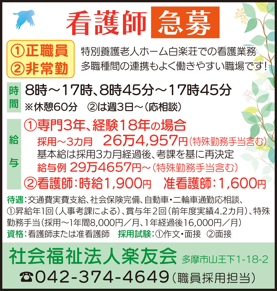 ■求人窓口…社会福祉法人楽友会【電話】042-374-4649(職員採用担当)
