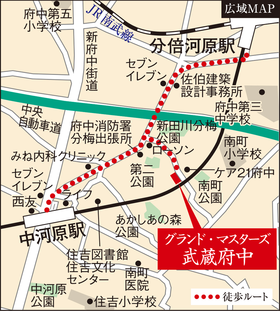 また、多摩川が近く都内とは思えぬほど自然豊かな環境下にありながら、JR線と京王線が交差する「分倍河原駅」と、京王線「中河原駅」の2駅が利用できる利便性の高さも大きな魅力の一つ。