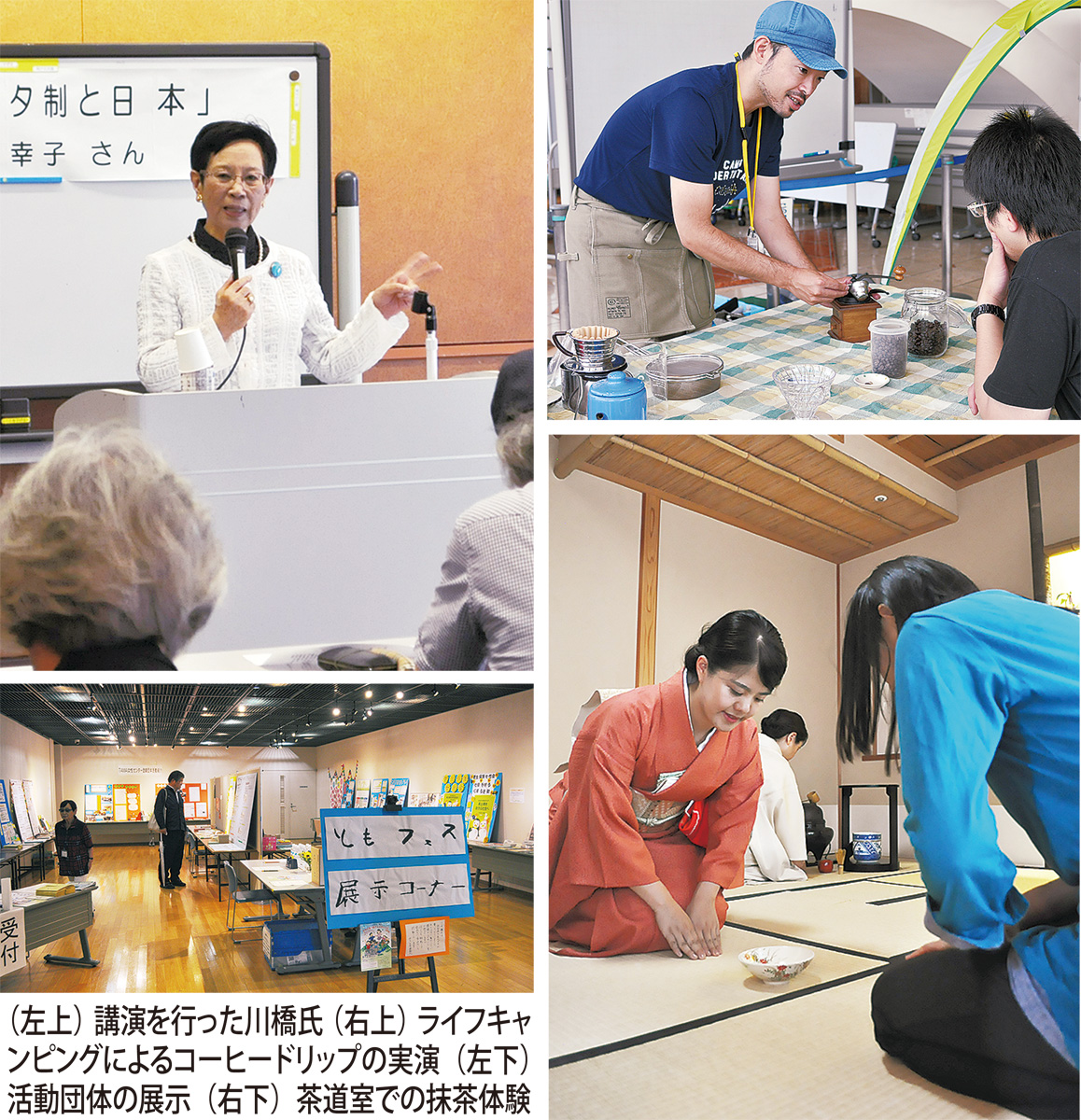 映画『幸せをつかむ歌』の上映会や、料理研究家の森下園子氏による「防災パッククッキング」、(一社)メイクボランティアM・B・Lによるハンドマッサージ体験、抹茶体験、同センター登録団体の活動紹介や防災の展示などが行われた。元総理府婦人問題担当室長でクオータ制を推進する会役員の元参議院議員・川橋幸子氏による講演会では、男女共同参画法やクオータ制についての説明に来場者は熱心に耳を傾けていた。