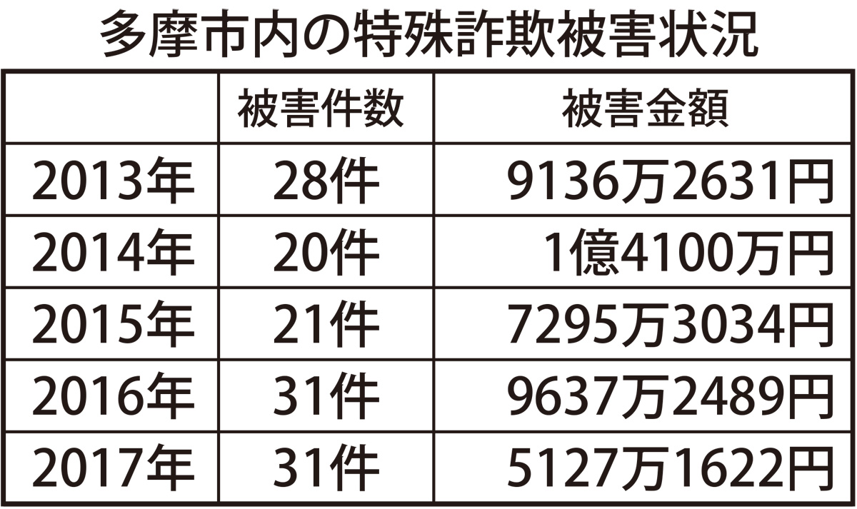 多摩市内では、2014年に1億4100万円(被害件数20件)と被害額が最も大きく、16年、17年はそれぞれ約9637万円、約5127万円と総被害額は減っているものの、被害件数がともに31件とここ5年で増えている(表参照)。