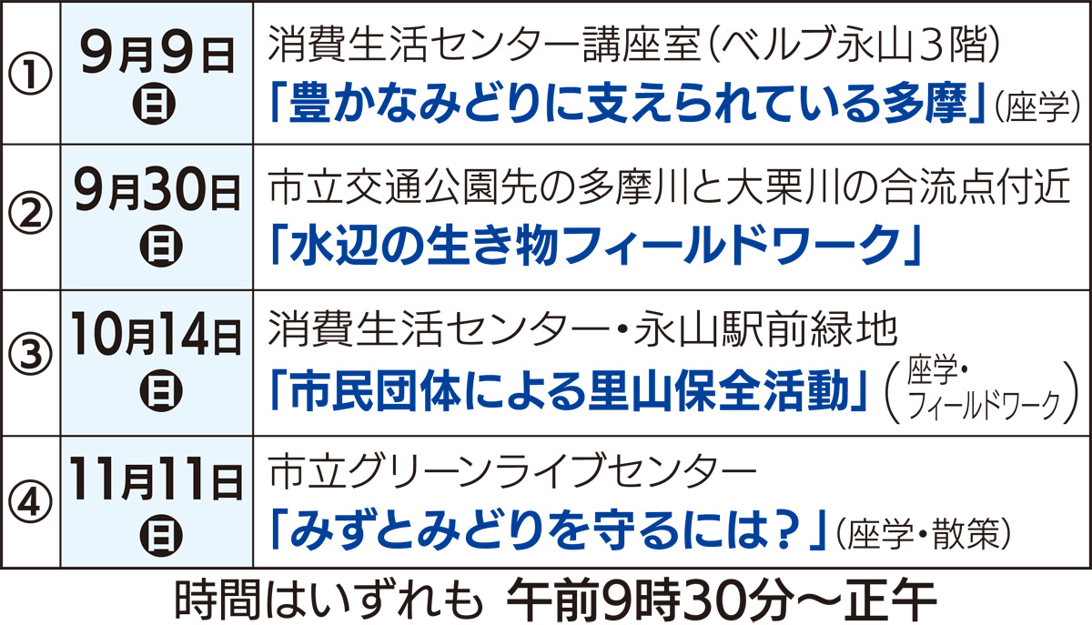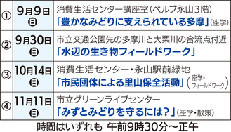 市民と多摩市の協働で環境保全啓発事業を行っている「多摩市民環境会議」。エコロジーの視点から多摩市を学ぶことを目的に同セミナーを開催している。今年度は「みずとみどり」をテーマに、座学やフィールドワークを行う(日程・会場等は表参照)。対象は満18歳以上の市内在住・在勤・在学の人。定員は30人(応募多数の場合抽選)。
