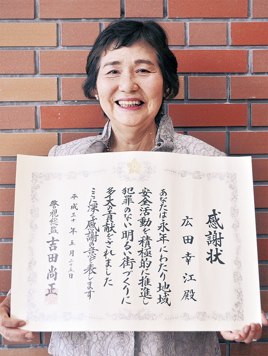 その中で、長年にわたって地域安全活動を積極的に行い、犯罪のない明るいまちづくりに多大な貢献をしたとして、警視総監賞が贈られたのが、広田幸江さんだ。これまでに多摩中央署管内で団体として同賞を受賞したことはあったものの、個人での受賞は今回が初だという。