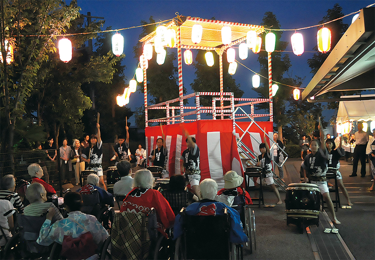 毎年、施設の利用者や職員、地域住民と楽しみ、ふれあう場にと開催されているこのイベント。浴衣を着た職員が来場者を出迎える中、今年も地域やボランティアの人たちがかき氷や焼き鳥などの各種屋台で販売を行った。また屋内のステージや屋外のやぐらで愛宕太鼓、都立松が谷高校太鼓部の演奏、松が谷52番地こども会の踊りなどが披露され、来場者たちも盆踊りを楽しんだ。最後には、花火が打ちあがり、大盛況のうちに祭りは幕を閉じた。