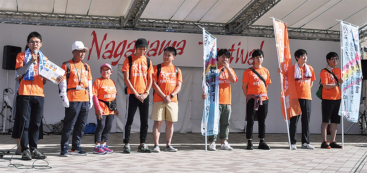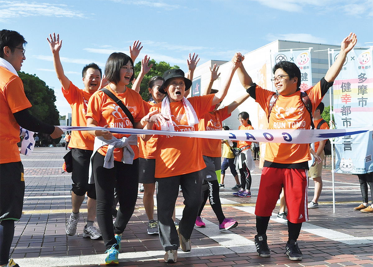 当日は「聖蹟桜ヶ丘」「永山」「唐木田」の3コースに分かれて、ゴールのパルテノン多摩を目指してスタート。協力店や協力施設で休憩しながら、沿道の声援を受けて市内を走った。永山コースでは、この日行われていた「永山フェスティバル」にも飛び入りで参加。ステージに登壇し、プロジェクトのPRも行った。ゴールのパルテノン多摩大階段下では「RUN伴東京」実行委員会公認応援歌を歌うデュオ「オレンジリングス」の歌に出迎えられる中、ランナーたちは次々に笑顔でゴールテープを切っていった。