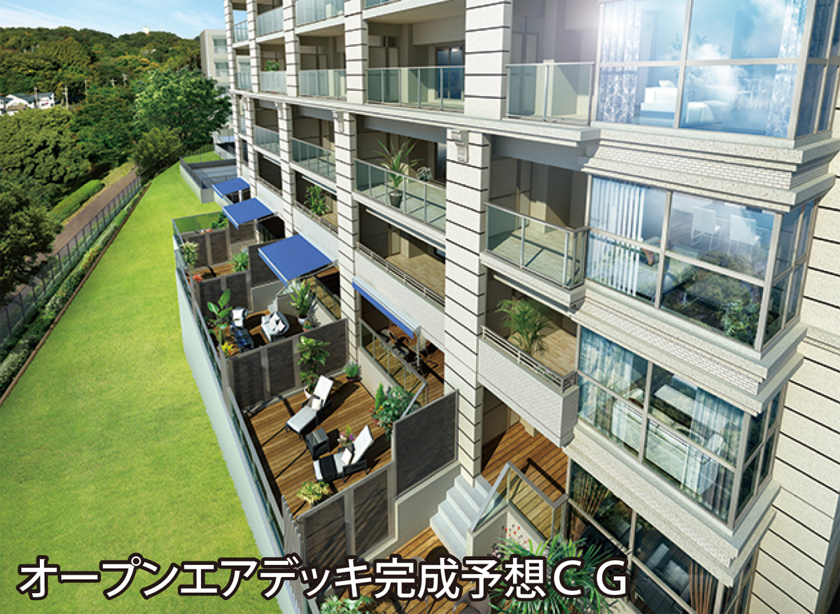 注目は、3mバルコニーやルーフバルコニー、オープンエアデッキなど各戸で採用する多彩なバルコニー。眺望の良さの中で自由な使い方を楽しむことができる仕様だ。