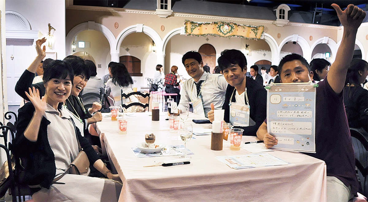 参加者は、それぞれがプロフィールボードを掛けて、各テーブルに着席。食事をした後、男女で助け合いながら絵を描き、ハローキティと記念撮影を行った。その後は「最近感動したこと」「もらって嬉しいプレゼント」などをテーマに会話に花を咲かせ、連絡先などを交換し合った。