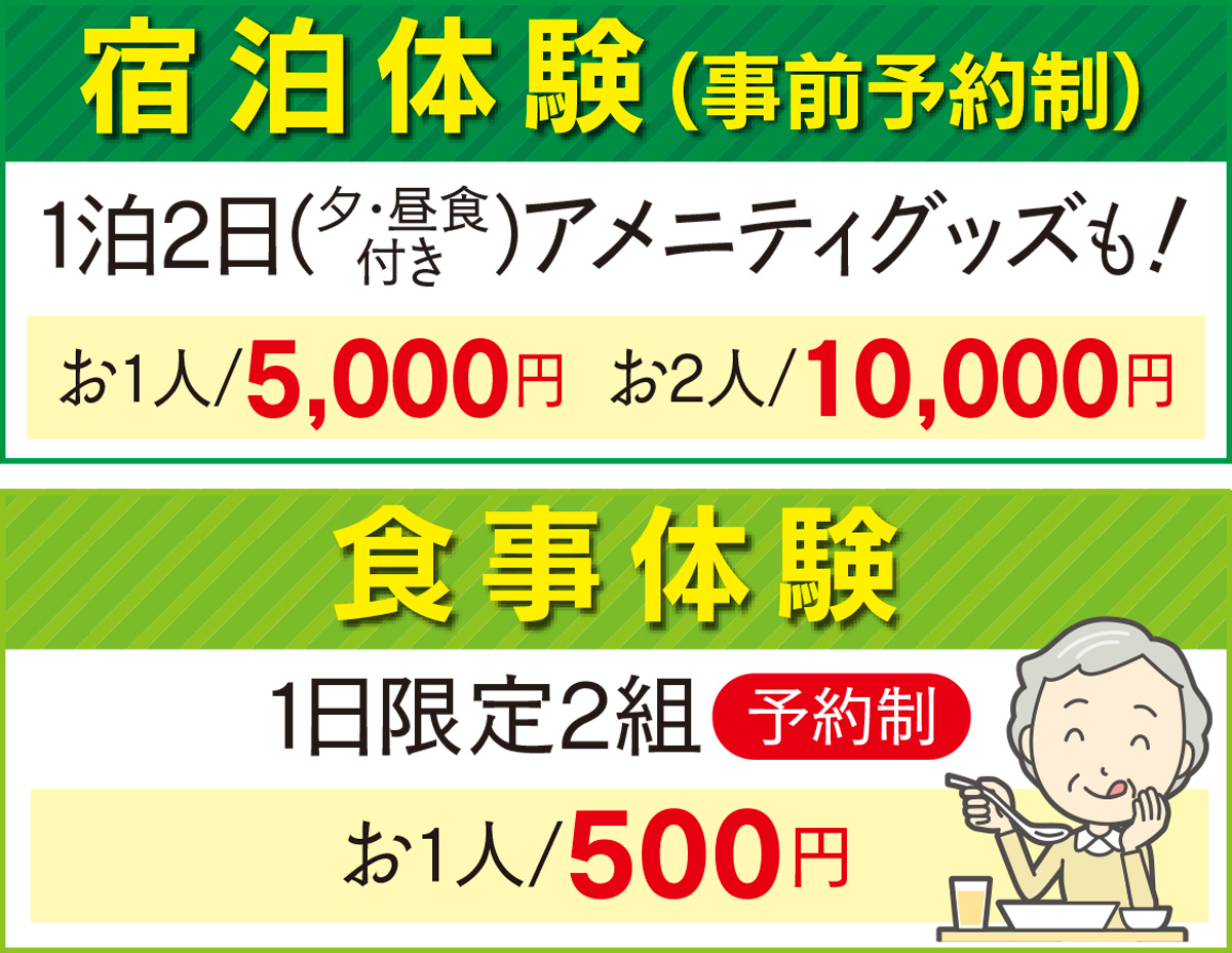 現在宿泊体験(1泊2日2食付・5千円)を受付中。専属シェフの料理が楽しめる食事体験も(500円/予約制)。気軽に問合せを。高齢な親の呼び寄せや住み替えを検討する人もぜひ利用を。