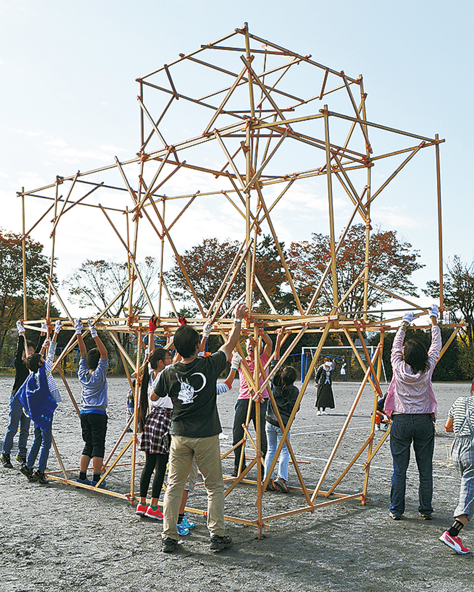 6年前から日本建築家協会に所属する建築家の協力のもと、同授業を行っている同校。当日は、5・6年生が12班に分かれて作業を開始。事前に授業の中で製作した割りばしの模型をもとに、長短2種類の角材と輪ゴムを使って実際に家を建てていった。途中、耐久性の問題から一部設計を変更したり、重みで崩れてしまったりと試行錯誤しながらも、最大で6m近い高さの家が完成した。