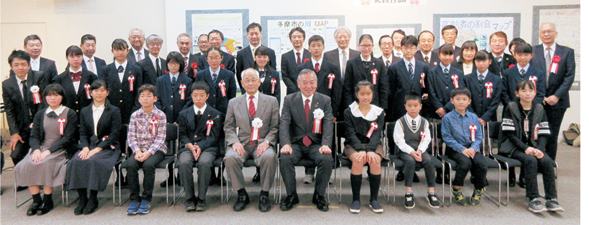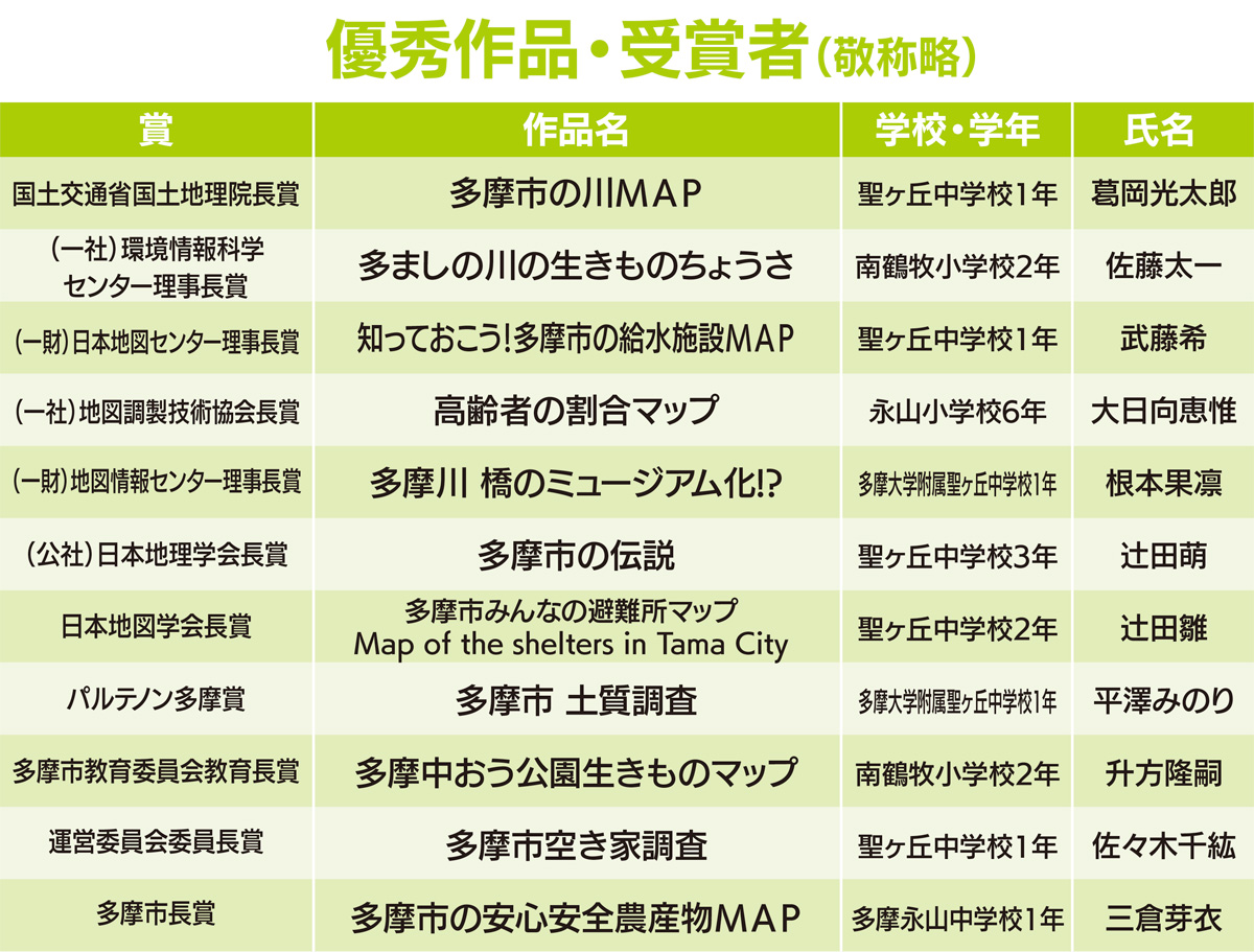 多摩市内在住・在学の小学生・中学生が日常で触れたり、感じたりしている身の回りの生活環境を題材に、自ら調査・研究して地図として表現する「多摩市身のまわり環境地図作品展」が11月30日から12月2日まで、パルテノン多摩で開催された。2日には表彰式が行われ、優秀賞11作品(左表参照)、奨励賞9作品の受賞者に、同運営委員会から賞状等が手渡された。