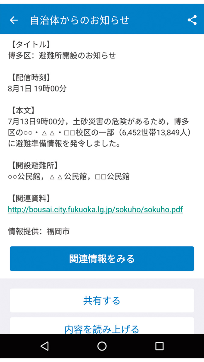 二つ目は、同社のホームページと、同社が提供する「防災速報アプリ」で、多摩市からの緊急情報を配信。同社が開発したこのアプリは、現在、全国での利用者が増えており、1500万人が利用しているという。事前にアプリを携帯電話やタブレットでダウンロードし、地域設定で「多摩市」を登録しておくと、多摩市から提供された避難情報や、台風接近時に注意喚起など、市民の安全を守るための情報が配信される。