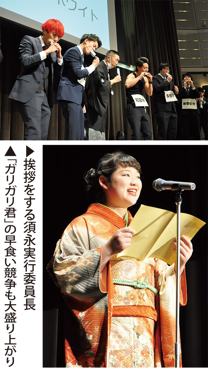 その後、当時の中学校の恩師からのビデオメッセージがスクリーンに流れると大きな歓声があがった。続けて行われた「思い出クイズ」では、懐かしの問題が出され、会場は大盛り上がり。4人が登壇した成人の主張では、弾き語りや将来の夢を語ったほか、ダンスも披露された。今年の目玉企画、旅行券やテーマパークのチケットが当たる抽選会も行われ、会場は盛り上がりを見せていた。