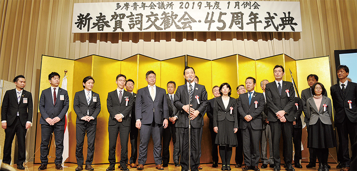多摩青年会議所(JC、白石翔理事長)の1月例会「新春賀詞交歓会・45周年式典」が1月28日、京王プラザホテルで盛大に開催された。