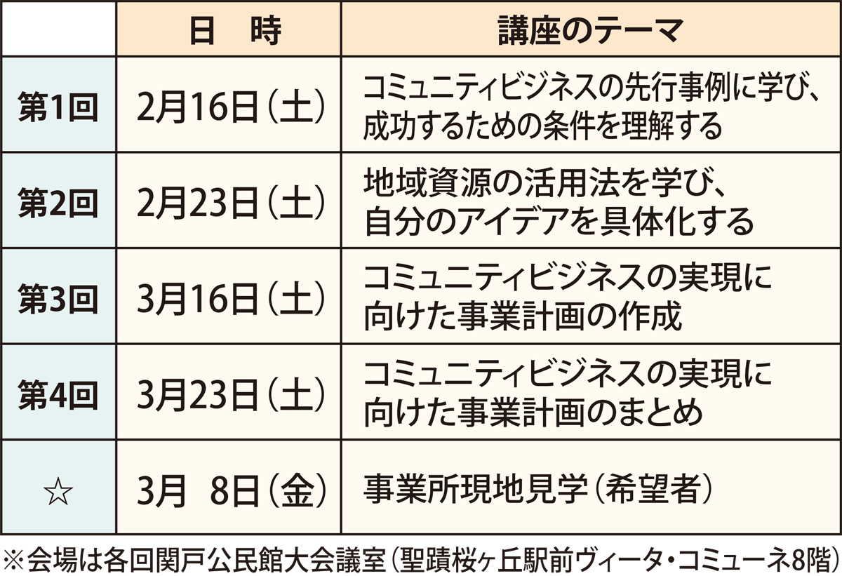 関戸公民館、多摩ボランティア・市民活動支援センターが主催する講座「コミュニティ起業塾」が2月16日(土)から4回シリーズで開催される。