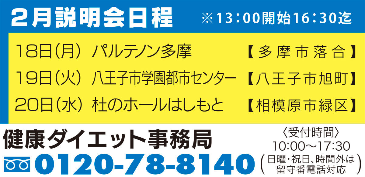 「健康ダイエット教室」は、カロリー計算や運動でのダイエットではありません。身体の仕組みを知って、身体の仕組みに逆らわない食事の仕方を身につけることが、リバウンドのないダイエットに必要。