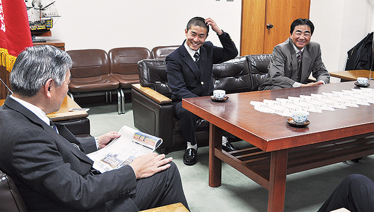 この日、松室主将、永田監督、渡邊隆部長、福田三郎校長が入場行進の際に使用する選抜旗を持って市役所を訪問。冒頭、福田校長が10年ぶりの出場を阿部市長に報告すると、市長は「夏の都大会でベスト4に入って、監督としては狙っていたと思う。最近メキメキと素晴らしい成績を上げておられたので、今回選ばれて心から嬉しい」と話した。
