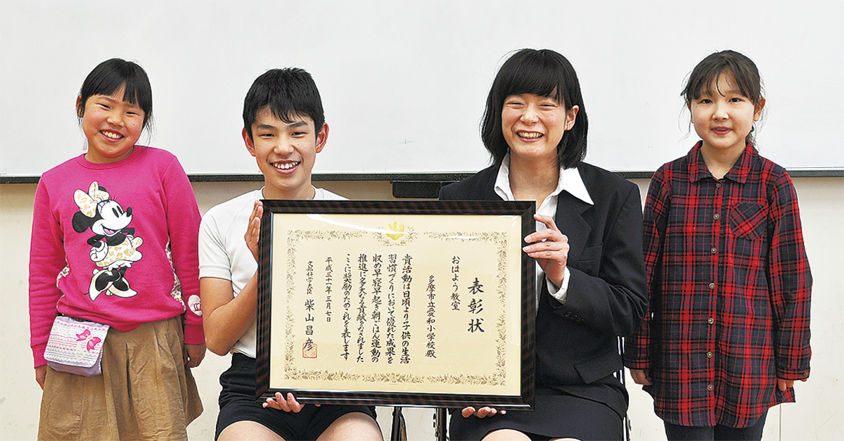 今回、愛和小学校が受賞した「早寝早起き朝ごはん」運動は、文部科学省が推進する取り組みのひとつ。子どもたちの健やかな成長のために必要な、基本的な生活習慣の定着に向けた取り組みの推進を図ることを目的に、その活動が他と比較して顕著に優れ、地域全体への普及効果の高い取り組みに対し、2012年から隔年で表彰を行っている。今年は全国で50校が表彰され、都内で表彰されたのは同校のみ。市内では初の受賞となった。