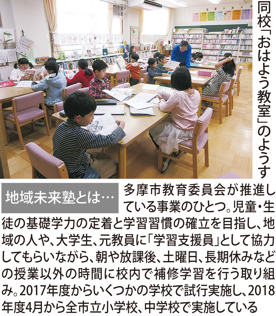同校の「おはよう教室」が始まったのは2016年度から。冬場の登校が遅れがちになる子どもたちに、朝早く登校してもらい、温かい飲み物を飲みながら、学習への準備や宿題のわからないことを教員に質問したり、読書することで、心と体のリズムを作ってもらおうと試行的にスタートした。そうした取り組みが、多摩市教育委員会が推進している子どもたちの基礎学力、学習習慣の定着を目的とした「地域未来塾」へとつながり、昨年度から本格的に始まった。