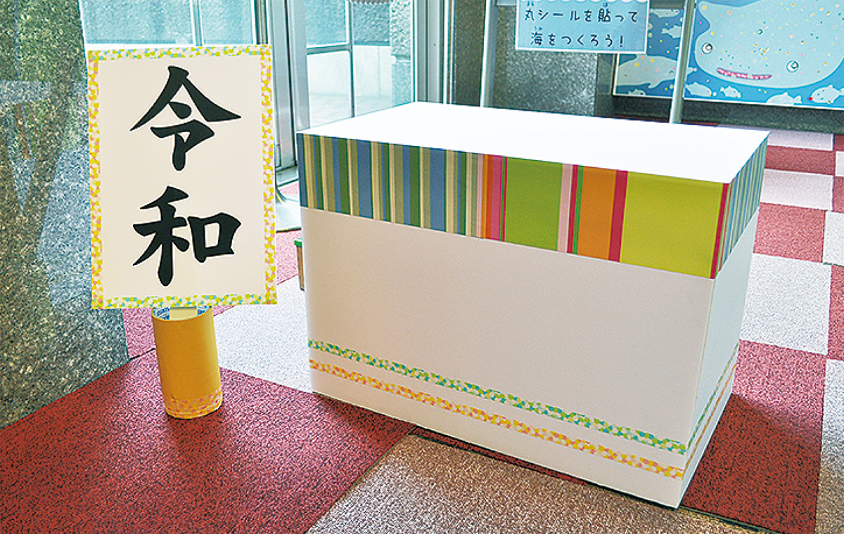 その一角に設けられたのが、この「令和」の写真撮影コーナー。令和の文字が書かれた額と、司会台、マイクが置かれている。多摩市文化振興財団の映画担当者のアイデアで設置することになったという。「少し前から設置を始めたのですが、皆さん面白がって撮影されていますね」と同財団の瀧澤拓樹さん。キッズスペースにも子ども用の額と机が用意されている。