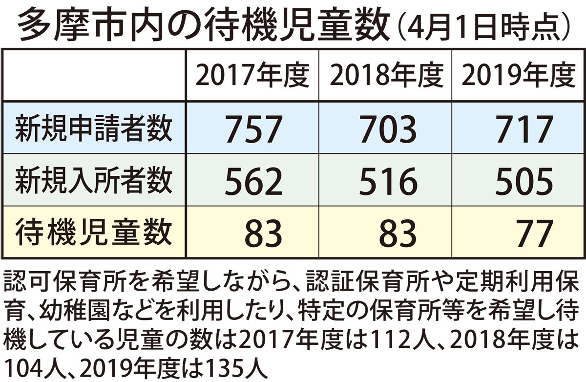認可保育所などに入ることのできない多摩市内の待機児童の数が、4月1日時点で77人と昨年に比べて6人減少したことが本紙の調べで分かった。市では、待機児童数ゼロを目標に掲げ、今年度に向けて認証保育所の定員増、企業主導型保育所への補助などの対策を行っており、それが奏功した形となった。