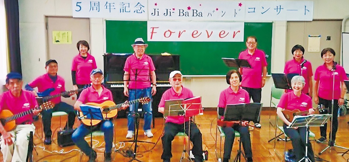 平均年齢70歳の「JIJI&BABAバンド Forever」の結成5周年記念コンサートが諏訪地区市民ホールで開催された。