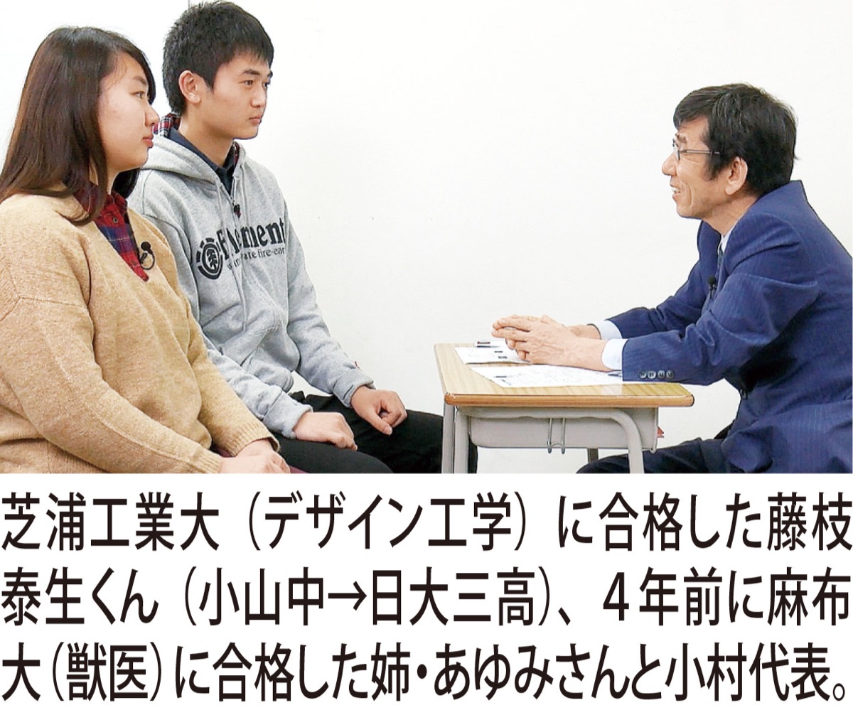 現役生も大健闘!芝浦工大(デザイン工)に合格の藤枝泰生くん、麻布大(獣医)に合格の姉・藤枝あゆみさんと小村洋代表の対談を紹介。