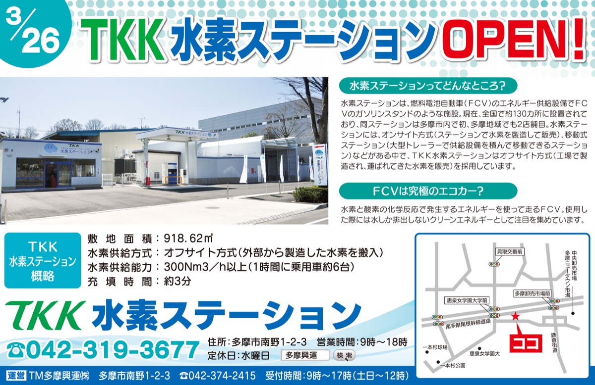 市内初となる水素ステーション『TKK水素ステーション』が3月26日、南多摩尾根幹線道路沿い「多摩卸売市場前交差点」そばにオープンした。運営するのはTM多摩興運(株)。「究極のエネルギー」と言われる”水素”を使った燃料電池自動車(FCV)の供給設備となる水素ステーション。全国でもまだ数が少なく、多摩地域でも同店で2店舗目となる。多摩市から水素社会の実現に向けて期待が寄せられる。