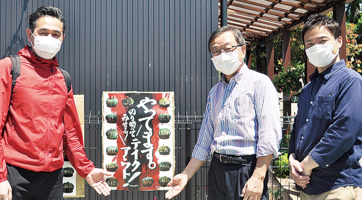 ポスターを企画したのは関戸在住の小林昭一さん。馴染みの居酒屋「かど鉢」の勝手口に「のりきってみせる」と磁石で書かれた言葉があり、胸を打たれた。他の店舗も同様に売り上げが激減し、経営に苦しんでいる。「美味しい食事を食べさせてくれるお店がなくなるのはつらい。乗り切ってもらうためにも何とか応援したい」、そう小林さんは決心した。幅広い年齢層の人にテイクアウトを利用してもらおうとポスターの制作を思い立ち、地元で活動するグラフィック・アートデザイナーの妹尾浩也さんにデザインを依頼。14店舗の名前が載ったポスター70枚が出来上がった。飲食店だけでなく、他業種、大型店、駅などに自ら掲示を呼び掛けてまわると、皆快く協力してくれた。