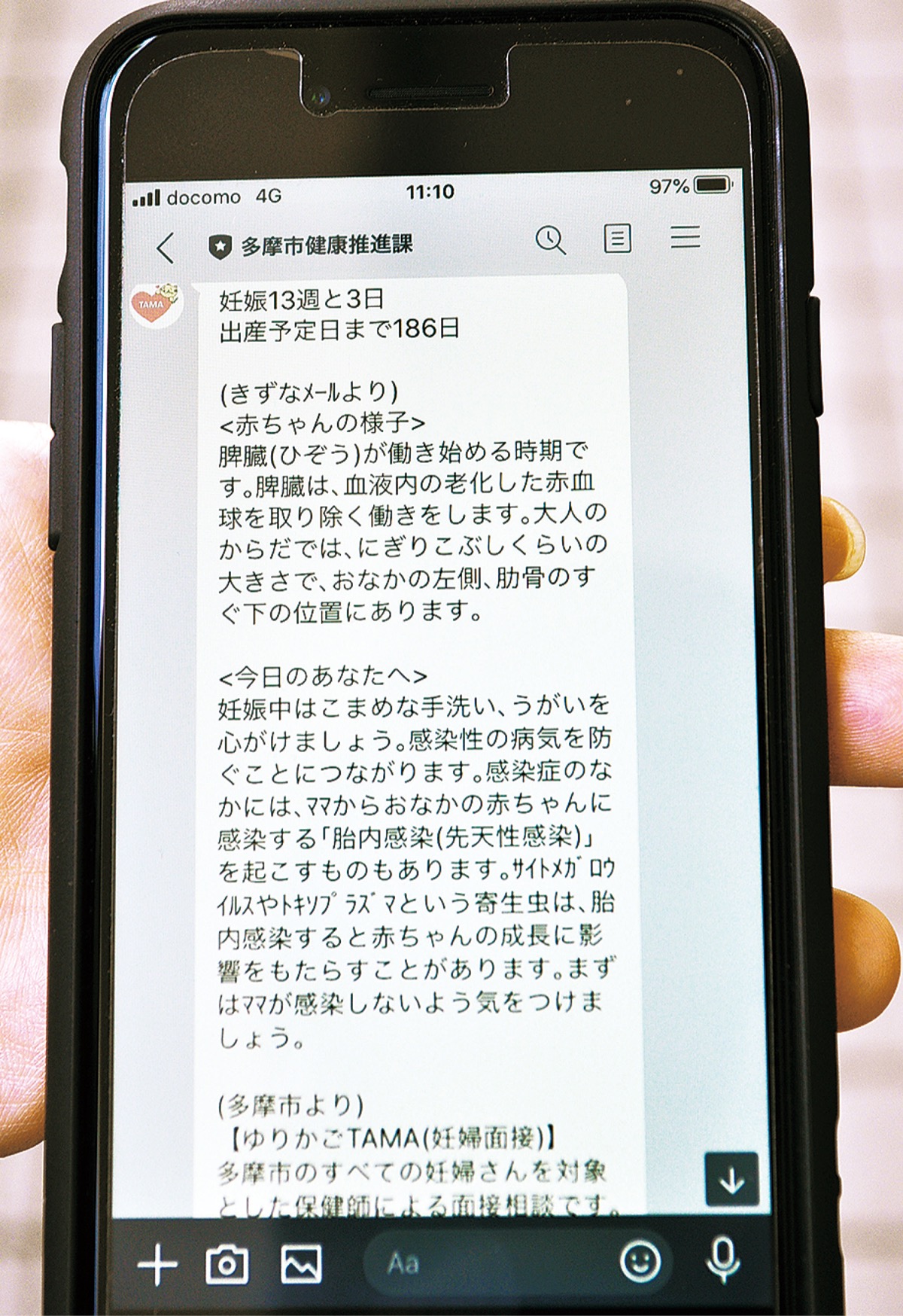 子育てしやすいまちを目指している多摩市。妊娠届を提出し、母子健康手帳を受け取った妊婦が安心して妊娠生活を過ごすことができるよう、保健師が様々な悩みや不安についての相談、受けることができるサービス、子育て支援サービスなどの情報を提供する個別面接「ゆりかごTAMA」を実施している。また妊娠期から0〜5歳の乳幼児の保護者を対象に、健診や予防接種、イベントなどの情報を逓信するアプリ「マチカゴ」の配信も行っている。