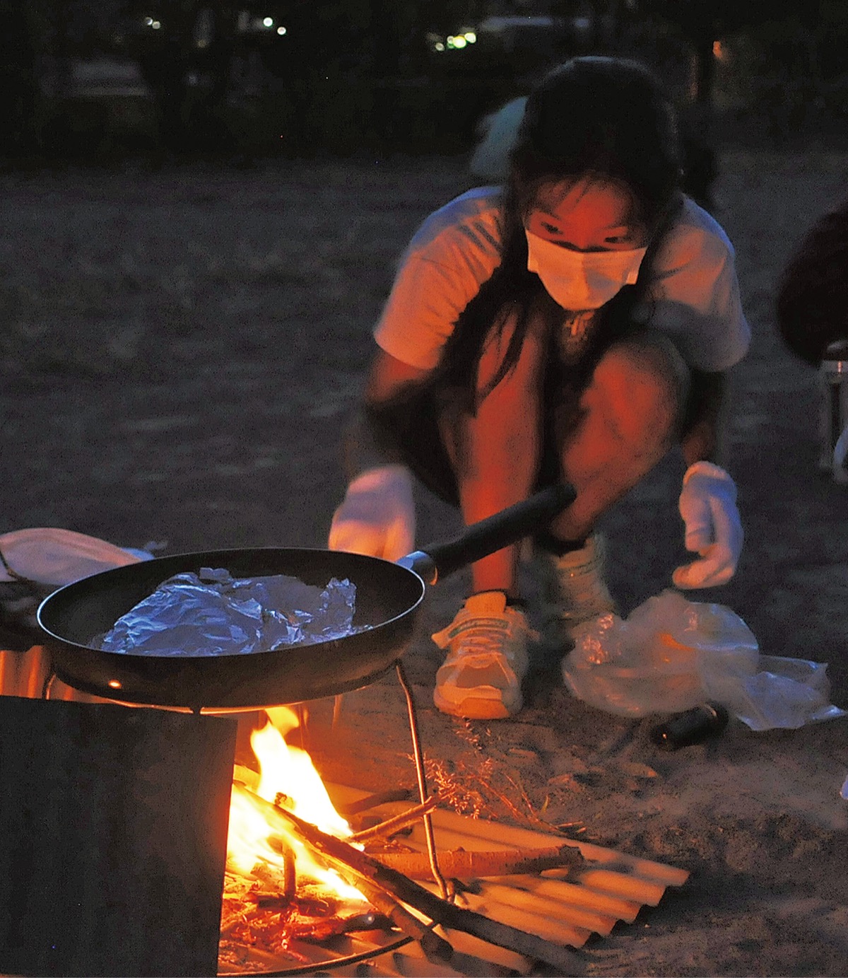 参加した菅蒼太朗くんは「ご飯を炊くのに薪をくべるのが大変だった。今回の経験を災害時などに役立てたい」と話した。指導にあたった同センターの永吉英記副センター長は「コロナの中で学校や皆さんと協力しながら、安全面に気をつけながら『自分のことは自分で』と今までにない形で実施することができた。子どもたちにとっても充実した内容になったと思う」と話していた。