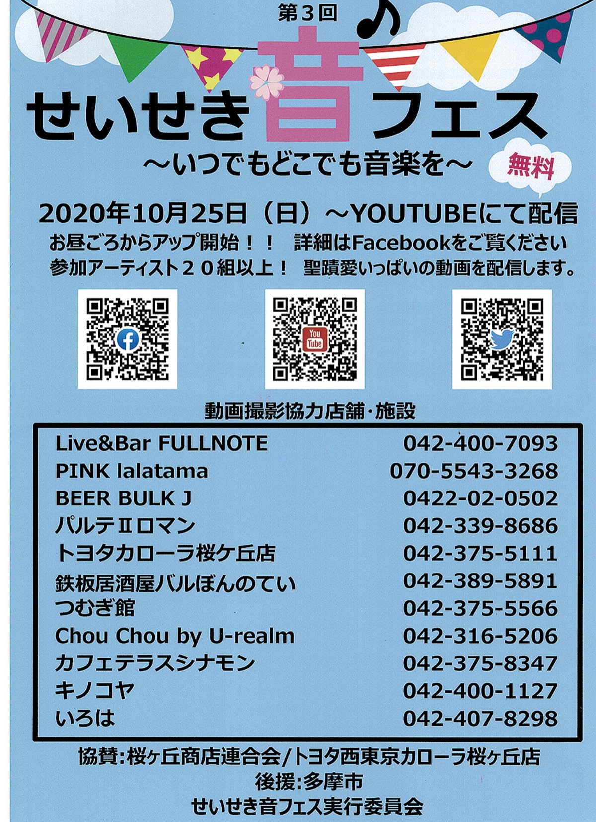 「聖蹟桜ヶ丘を音楽で盛り上げたい」-。そんな思いから始まったイベント「第3回せいせき音フェス」=画像=が10月25日(日)に開催される。今年は、新型コロナウイルスの影響によりオンラインで実施。正午からユーチューブや、ツイッター、フェイスブックなどで動画が配信される。